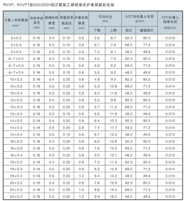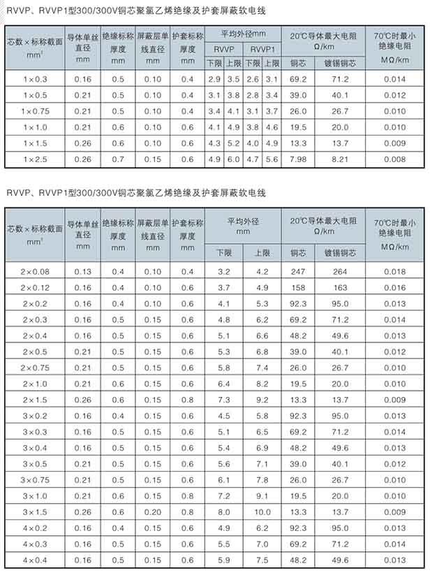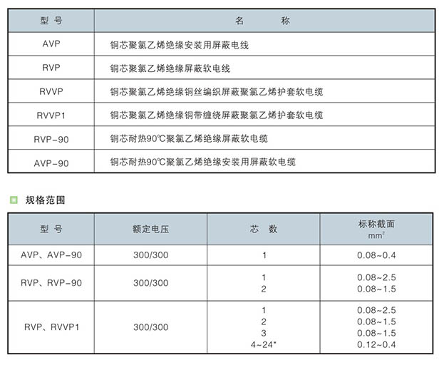 AVP(銅芯聚氯乙烯絕緣屏蔽電線)、AVP-105(銅芯耐熱150℃聚氯乙烯絕緣屏蔽電線)、RVP(銅芯聚氯乙烯絕緣屏蔽軟電線)、RVP-105(銅芯耐熱150℃聚氯乙烯絕緣屏蔽軟電線)、RVVP(銅芯耐熱150℃聚氯乙烯絕緣屏蔽聚氯乙烯護(hù)套軟電線)、RVVP1(銅芯耐熱150℃聚氯乙烯絕緣纏繞屏蔽聚氯乙烯護(hù)套軟電線)